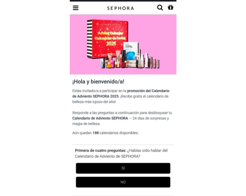 Aprovechando las rebajas, algunas webs prometen regalos “gratuitos” a cambio de completar encuestas. Una de las más virales que ha circulado por WhatsApp asegura que Sephora está ofreciendo un calendario de Adviento con productos de belleza totalmente gratis, pero es un caso de phishing. Los timadores te piden que primero compartas el enlace fraudulento para darle difusión al engaño y luego te solicitan tus datos personales.