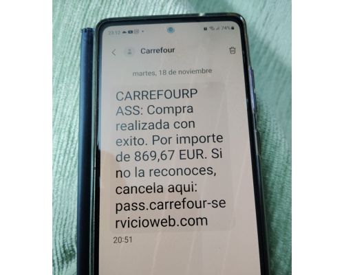 Este mensaje, que llega por SMS y simula ser de Carrefour, alerta de una supuesta compra de 800 euros y pide acceder a un enlace para cancelarla. El texto busca generar alarma y urgencia para que la persona actúe de manera precipitada y no compruebe que el link no tiene nada que ver con Carrefour. Es otro intento de los timadores para obtener tus datos bancarios y personales.