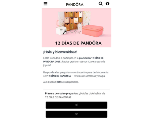 Pandora tampoco está regalando un set de joyería con doce sorpresas gratuitas a quienes respondan a una encuesta. Este tipo de enlaces, que se difunden por WhatsApp, buscan que los usuarios faciliten información personal sin comprobar si es un intento de engaño. En este caso, la web fraudulenta también pide pagar cuatro euros del supuesto envío además de los datos personales. Si sigues todos los pasos, te podrían dar de alta en un servicio online de pago desconocido y hacer cargos en tu cuenta.
