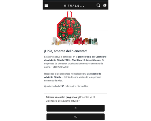 Otro enlace, también difundido por WhatsApp, redirige a una web que invita a responder preguntas para “participar en la promo oficial del calendario de Adviento Rituals 2025, 100 % gratis”. Como en los anteriores, es un caso de phishing que pretende hacerse con tus datos y tu dinero e incluso suscribirnos a un servicio online de pago.