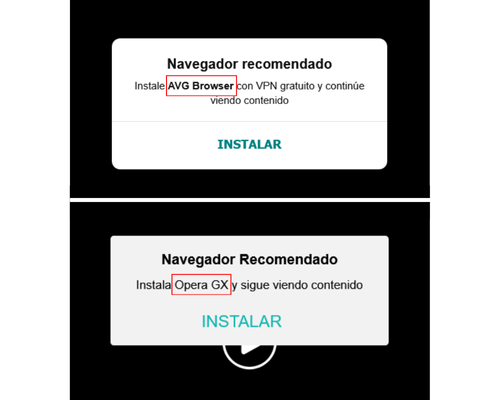 También pueden redirigir a páginas externas para descargar navegadores legítimos como Opera GX, Opera One o AVG Secure Browser.