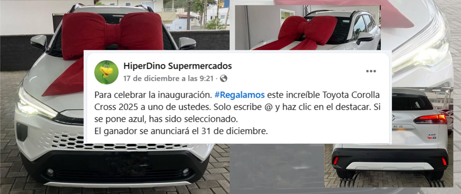 Hiperdino no está regalando un Toyota Corolla por comentar en esta publicación de Facebook: la cuenta no es la de esta cadena de supermercados