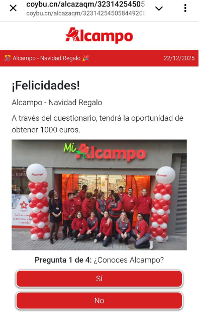 Ha circulado por WhatsApp un enlace que asegura que Alcampo sortea 1.000 euros por Navidad para gastar en compras. El link redirige a una web que utiliza el logotipo de la cadena y pide responder una encuesta y “elegir entre cajas de regalo” para encontrar el supuesto premio. Luego solicita que el enlace se comparta con contactos a través de WhatsApp para difundir el timo. Esta promoción no está vinculada a Alcampo y las páginas a las que redirige no corresponden a la web oficial de la cadena de supermercados.