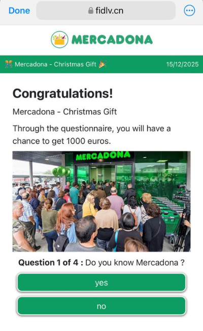 Durante las últimas semanas también ha circulado un contenido que afirma que Mercadona regala 1.000 euros para gastar en sus supermercados con motivo de la Navidad. El enlace dirige a una web fraudulenta que utiliza el nombre y el logotipo de la cadena donde aparecen tres botones que pueden redirigir a otros timos. Sin embargo, Mercadona ha advertido que no regala vales de compra ni hace promociones.