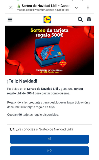Otro mensaje difundido por WhatsApp anuncia un sorteo de Navidad de Lidl con una tarjeta regalo de 500 euros. El enlace lleva a una página web que se hace pasar por el supermercado y pide completar una encuesta para obtener el supuesto premio. También solicita que rellenes un formulario con tus datos y pagar un supuesto coste de envío Cuidado porque con estos datos podrían darte de alta en un servicio online de pago que desconoces y hacer cargos en tu cuenta de forma periódica.