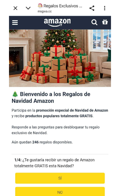 También se ha difundido un enlace que invita a participar en una supuesta promoción especial de Navidad de Amazon para recibir productos populares de forma gratuita. El mensaje redirige a una página ajena a la compañía que solicita responder a varias preguntas y después pide rellenar un formulario con datos personales y hacer un pago de cuatro euros.