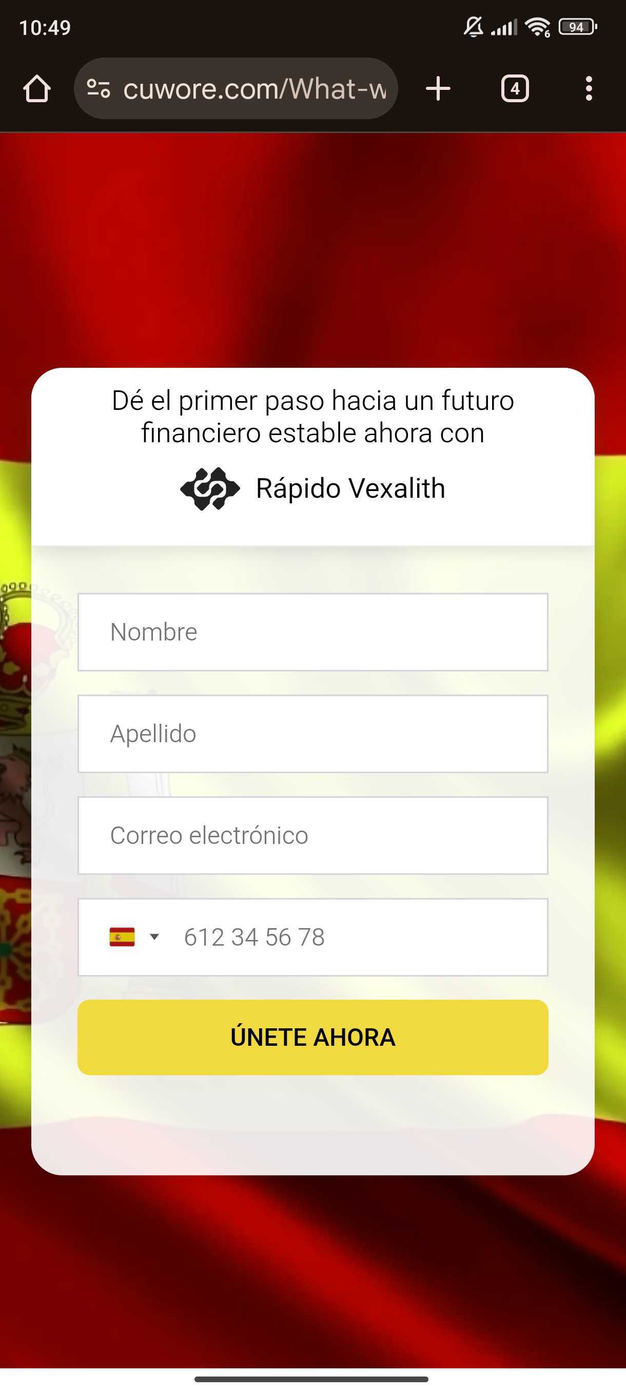 El enlace lleva a una página web que utiliza el nombre y el logo del diario El Mundo y que asegura que el cantante fallecido en 2025 Robe Iniesta utilizaba la supuesta plataforma de inversión Rápido Vexalith. Sin embargo, esta plataforma no está autorizada por la Comisión Nacional del Mercado de Valores (CNMV) y la URL de la web (cuwore [.] com) no tiene relación con la página oficial de El Mundo (elmundo.es/). La web fraudulenta asegura que la plataforma usa inteligencia artificial “para analizar los mercados” y afirma que hay que hacer una inversión inicial de 250 euros. Además, algunos de los botones de esta página no funcionan e incluye enlaces que redirigen al sitio web de la supuesta plataforma, donde aparece un formulario que solicita datos personales, como nombre completo, correo electrónico y número de teléfono. Esta es una práctica habitual de los ciberdelincuentes, como ya os hemos advertido en otras ocasiones.
