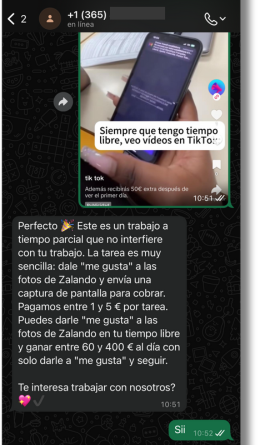 Los vídeos aparecen como anuncios promocionados en la red social e invitan a los usuarios a pinchar en un enlace. Al hacerlo, la persona es redirigida a un chat de WhatsApp con un número extranjero. Cuando el usuario muestra su interés por la supuesta oferta, el timador detalla la tarea que debe realizar para ganar dinero, como dar ‘me gusta’ a fotos de la tienda online Zalando y envíar una captura de pantalla como prueba A cambio, prometen pagos de “entre uno y cinco euros por tarea” y ganancias diarias de “entre 60 y 400 euros”.