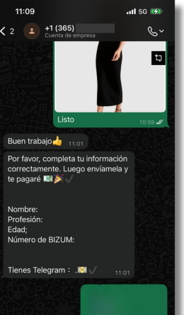 Tras completar la primera tarea, el contacto solicita datos personales con la excusa de efectuar el pago, como el nombre completo, la profesión, la edad y el número de Bizum, e incluso pregunta si el usuario tiene cuenta en Telegram. Poco después, la persona recibe el dinero prometido, lo que sirve para generar una falsa sensación de confianza y seguridad.