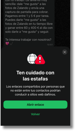 En este tipo de situaciones, WhatsApp muestra un mensaje de advertencia cuando el enlace al que accede el usuario le redirige a un número que no está entre sus contactos. La aplicación avisa de que los enlaces compartidos por personas desconocidas pueden conducir a sitios web dañinos y recomienda precaución antes de abrirlos.