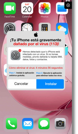 Estás navegando por Internet cuando, de repente, aparece una alerta que advierte de que tu móvil está gravemente dañado por un virus. El mensaje incluye una cuenta atrás y una serie de pasos urgentes para “solucionar” el problema. Te pide que instales y ejecutes una aplicación que supuestamente limpiará el dispositivo. Pero estos avisos, conocidos como scareware, buscan precisamente lo contrario: que descargues una app maliciosa con la que los ciberdelincuentes pueden acceder a tus datos y tomar el control del teléfono.
