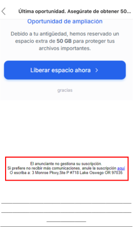 Se están enviando correos electrónicos que advierten de que el almacenamiento en la nube está casi lleno y ofrecen como solución adquirir ampliar ese espacio o bien confirmar la información de pago a través de un enlace. Sin embargo, si se accede a él, el usuario puede acabar siendo víctima de un timo, como ya hemos explicado en Maldita.es. En estos mensajes también aparece la opción de “anular la suscripción” mediante otro enlace, algo que también puede implicar riesgos.