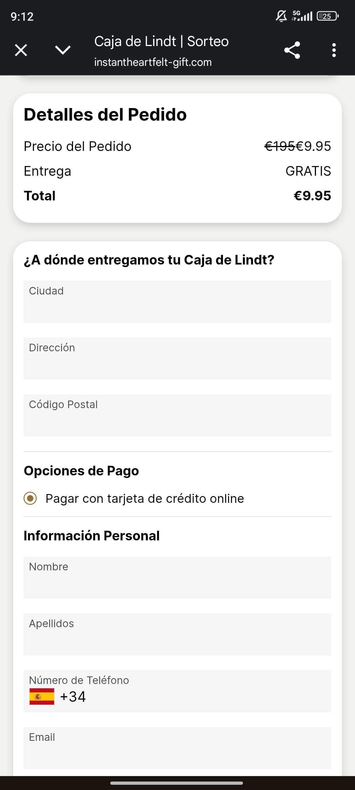 El enlace lleva a una web fraudulenta (instantheartfelt-gift [.] com) que suplanta a Lindt, pero no está relacionada con la compañía (https://www.lindt.es). La web invita a responder a una encuesta para poder conseguir la supuesta caja de chocolates y después pide elegir entre cajas de regalo para encontrarla, que siempre estará en la segunda opción. Tras este paso, nos redirigen a un formulario que solicita datos personales, como la dirección de envío, número de teléfono y correo electrónico, y nos pide pagar 9,95 euros del supuesto pedido. Cuidado porque podrían darte de alta en un servicio online de pago que desconoces y hacer cargos en tu cuenta sin tu conocimiento.